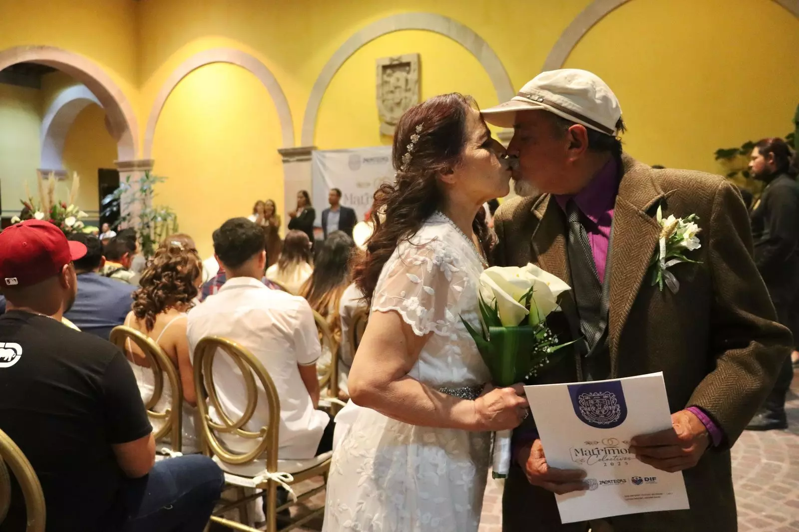 Durante la ceremonia, las parejas realizaron el tradicional corte del pastel de bodas, además de que los esposos brindaron y sellaron su unión con un romántico beso. El evento estuvo amenizado con canciones muy románticas para los enamorados, interpretadas por la Rondalla Zacatecas.